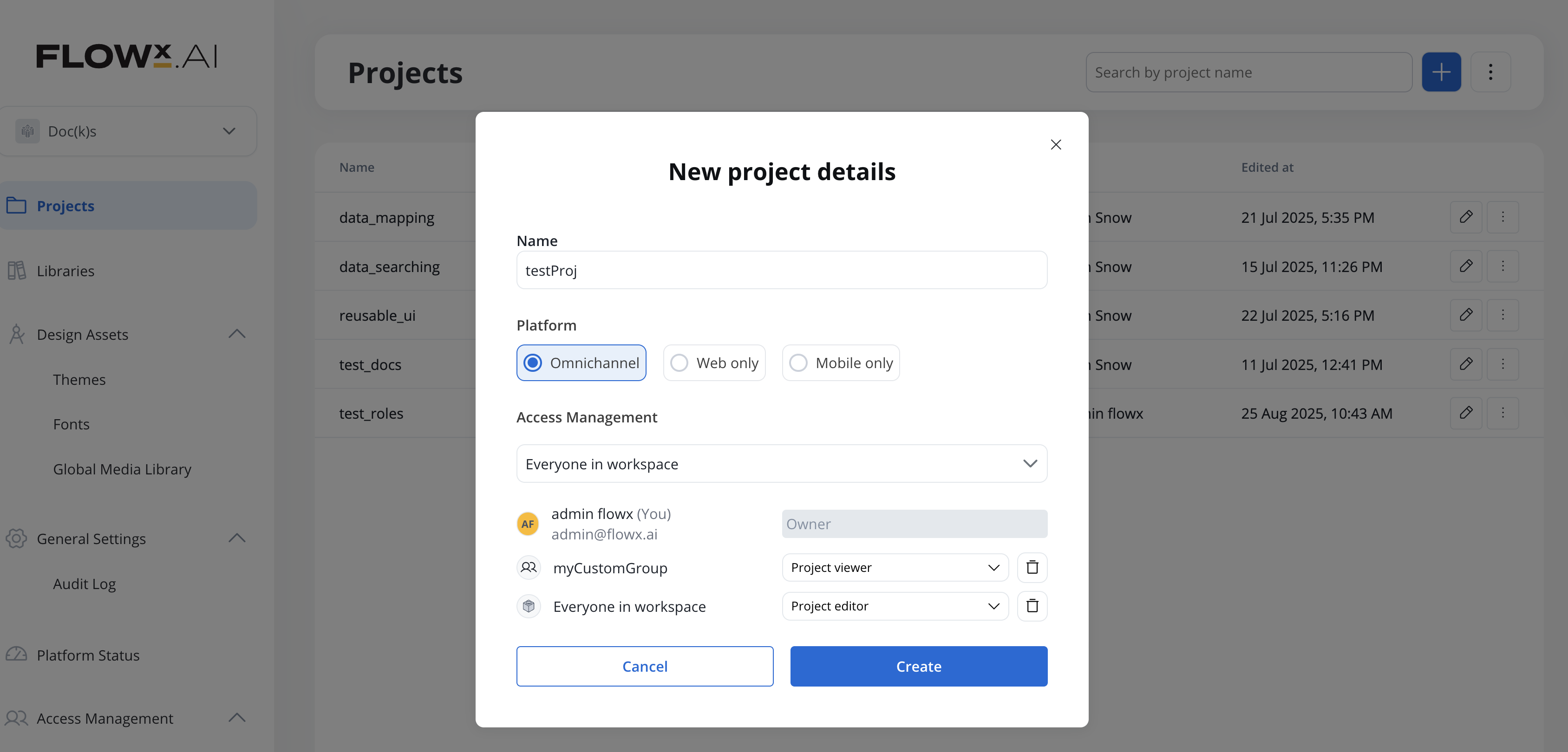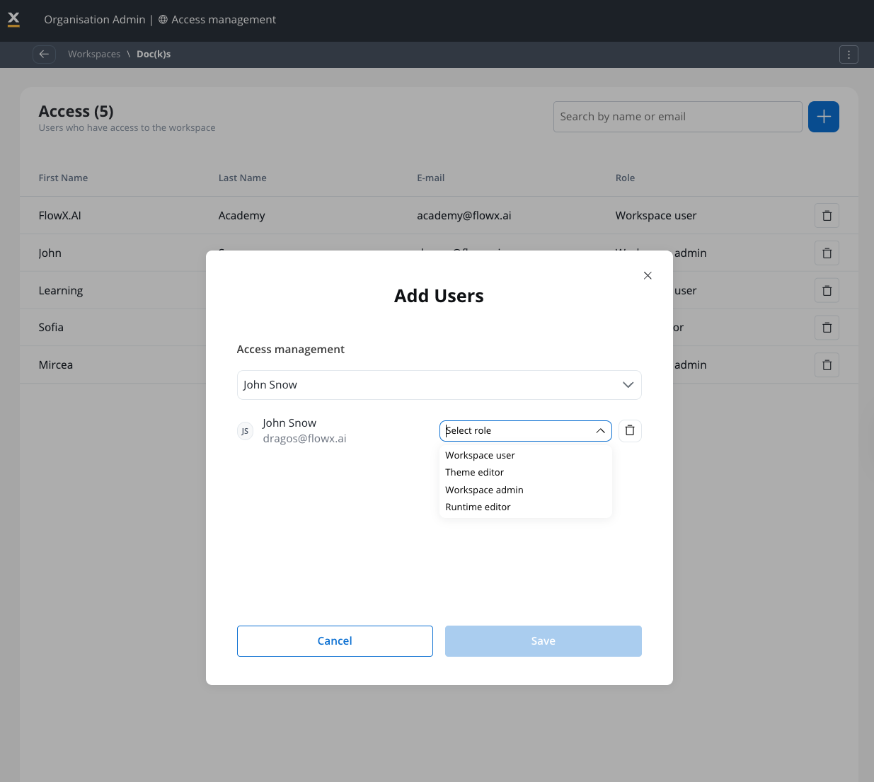 In FlowX 5.0 release, only pre-defined roles will be available to use for workspace and project/library access.