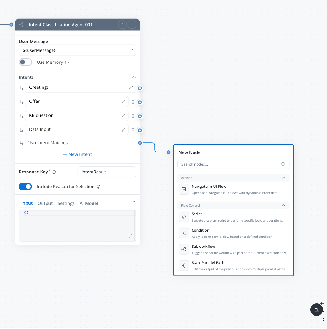 After classification, the node routes the workflow token to the matching branch:- Intent branches — the workflow continues along the branch whose intent description matched the user message