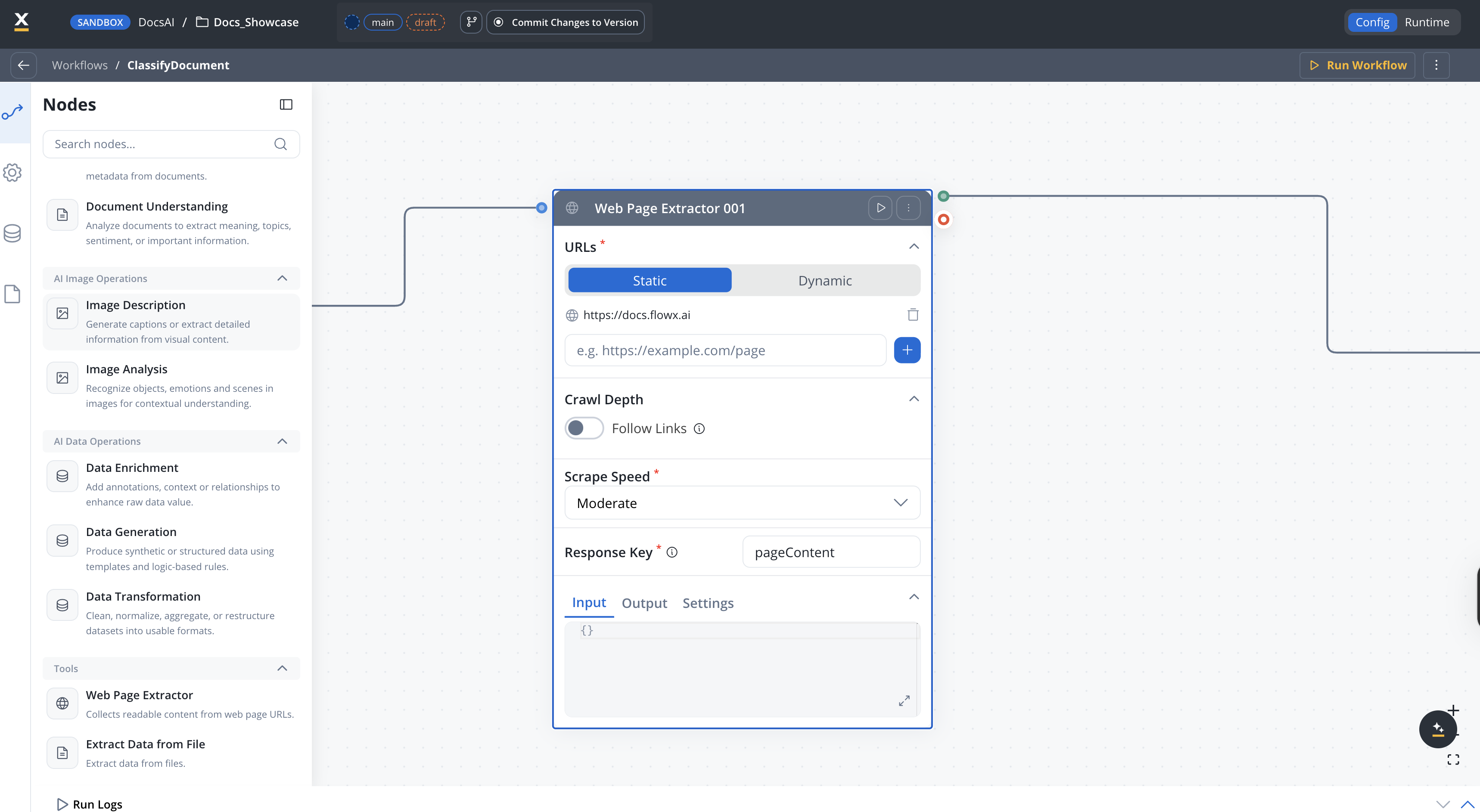 The Web Page Extractor node is a workflow node that collects readable content from web page URLs. It supports static URL lists and dynamic URL generation, configurable crawling depth with link following, and adjustable scrape speed presets.
