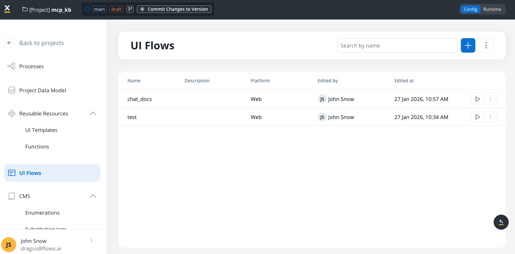 Select an existing UI flow or create a new one. This opens the UI Designer where you’ll see the Config and Runtime tabs at the top right for switching between configuration and preview modes.