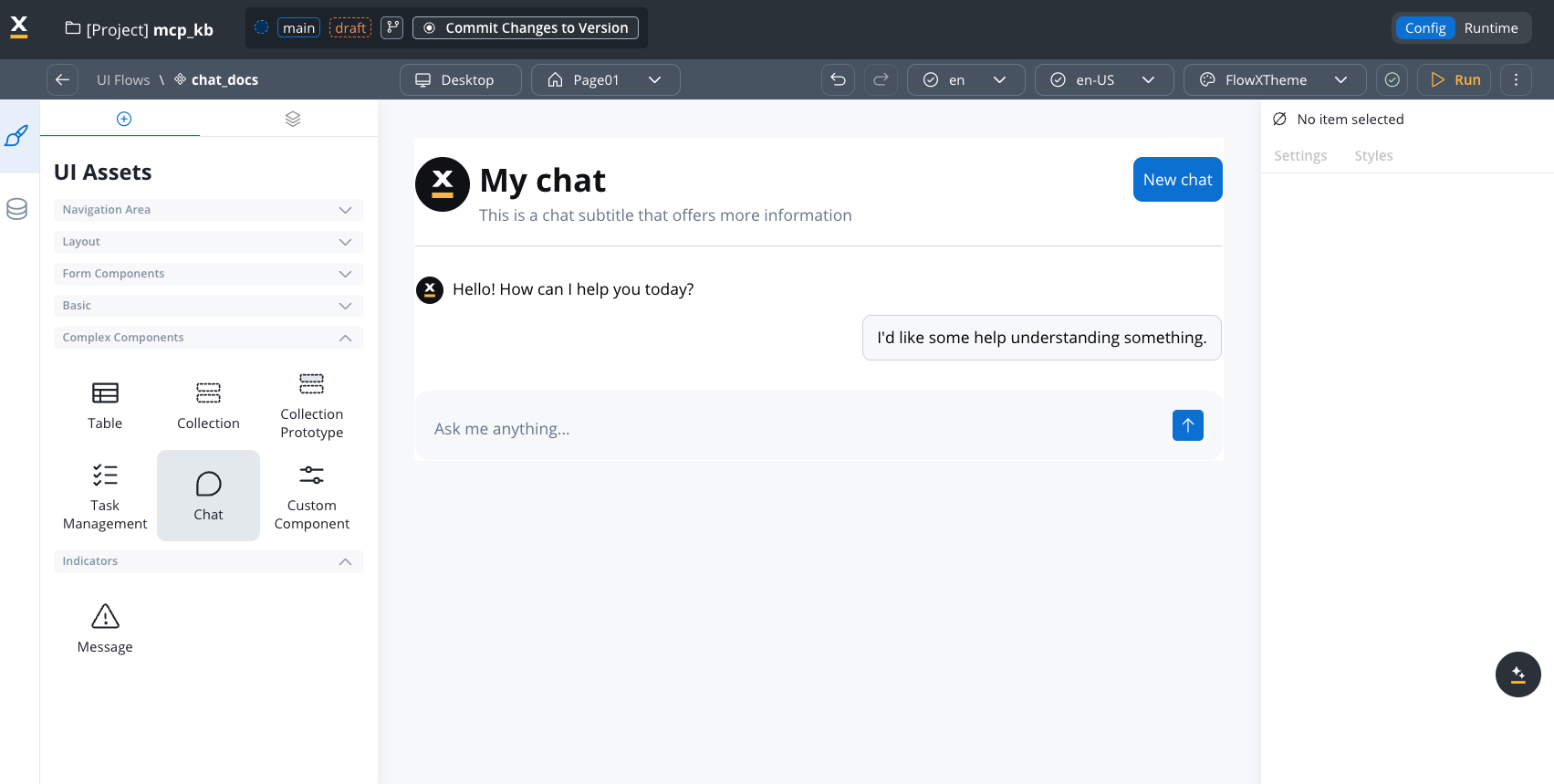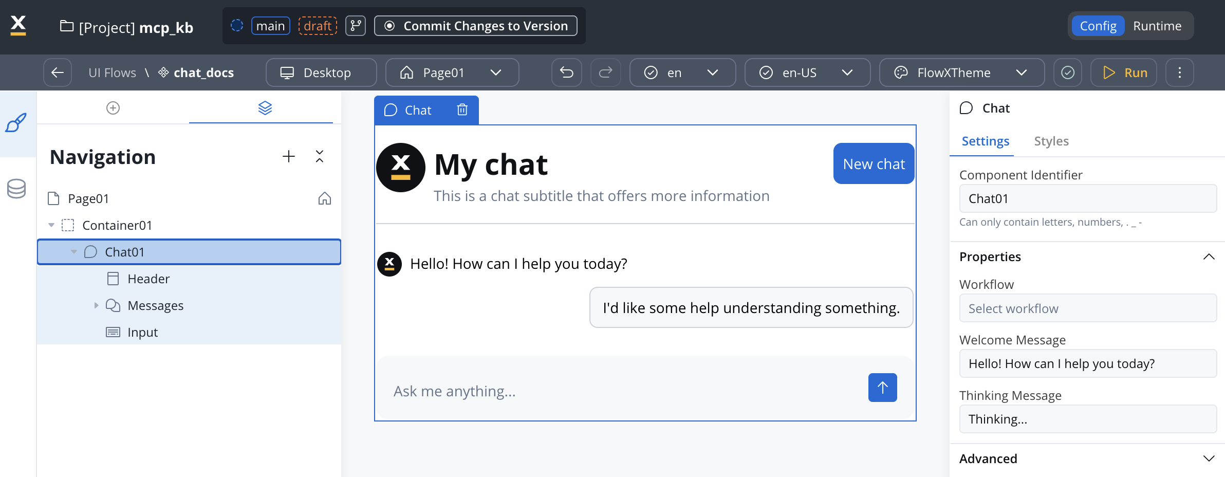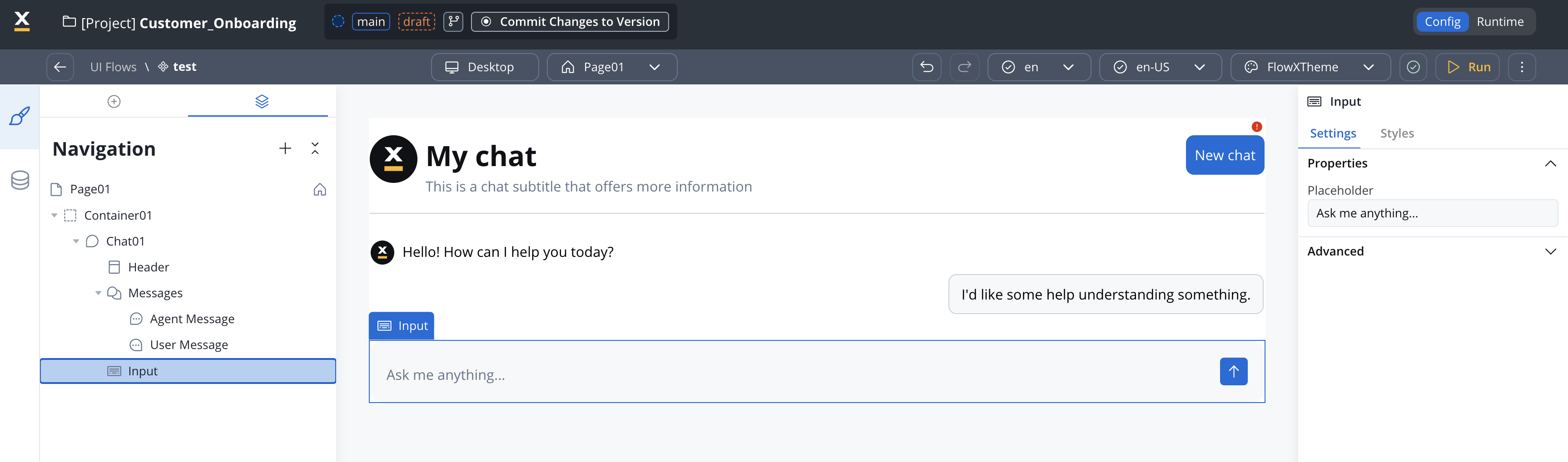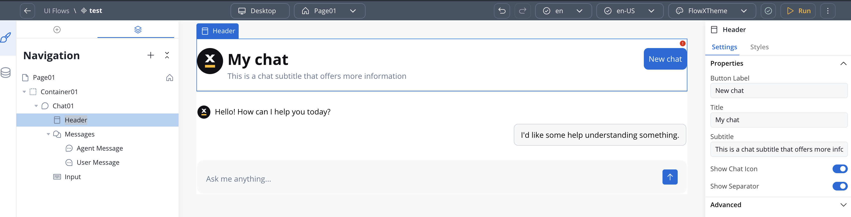 Configure component behavior and content through the Settings tab in UI Designer (UI Flows → select a UI flow → select component):Chat