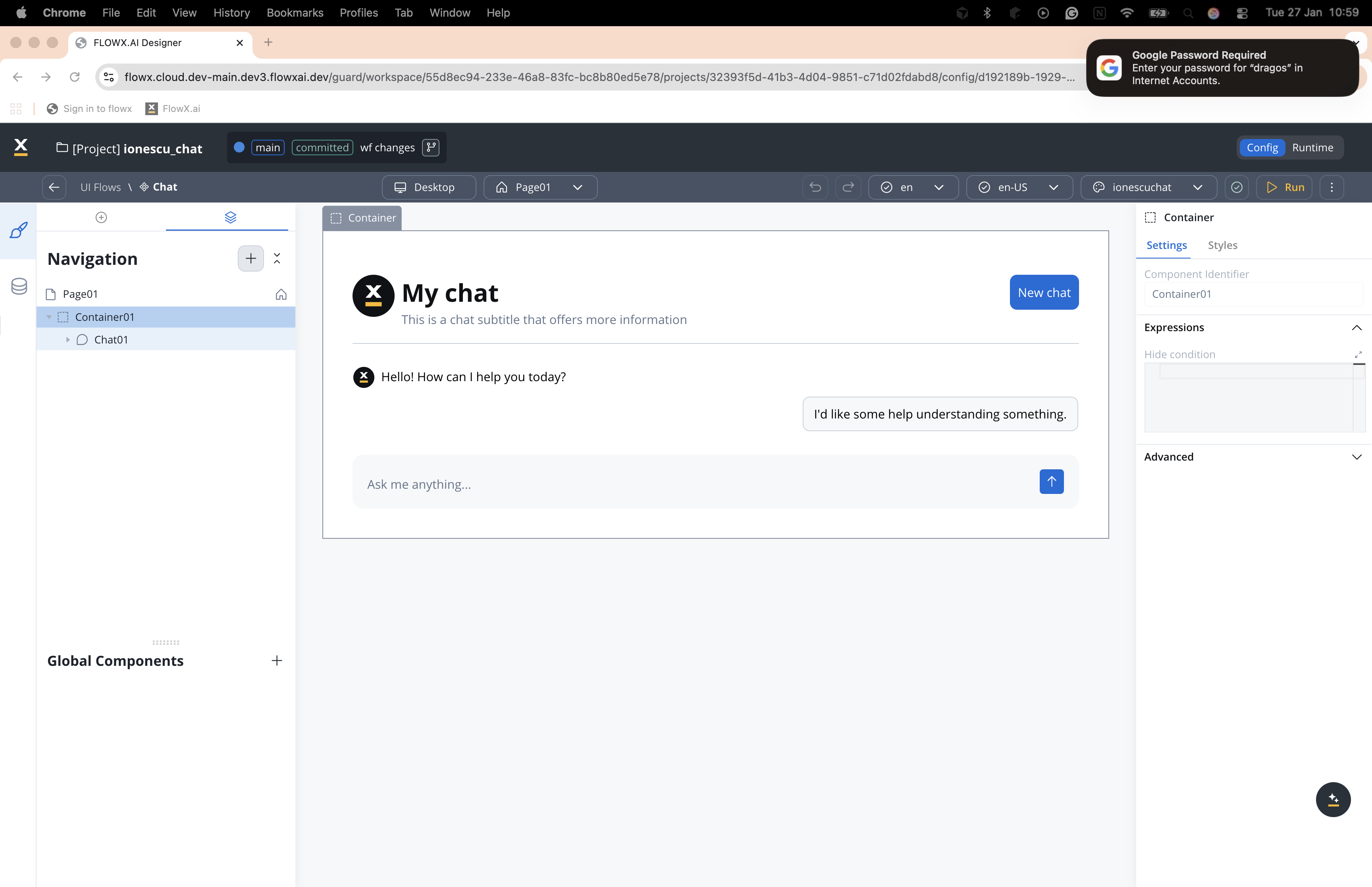 The Chat component serves as the primary interface for conversational AI experiences in FlowX. It allows users to interact with AI agents through natural language conversations, enabling use cases such as customer support, data collection, process guidance, and intelligent assistance.Key features