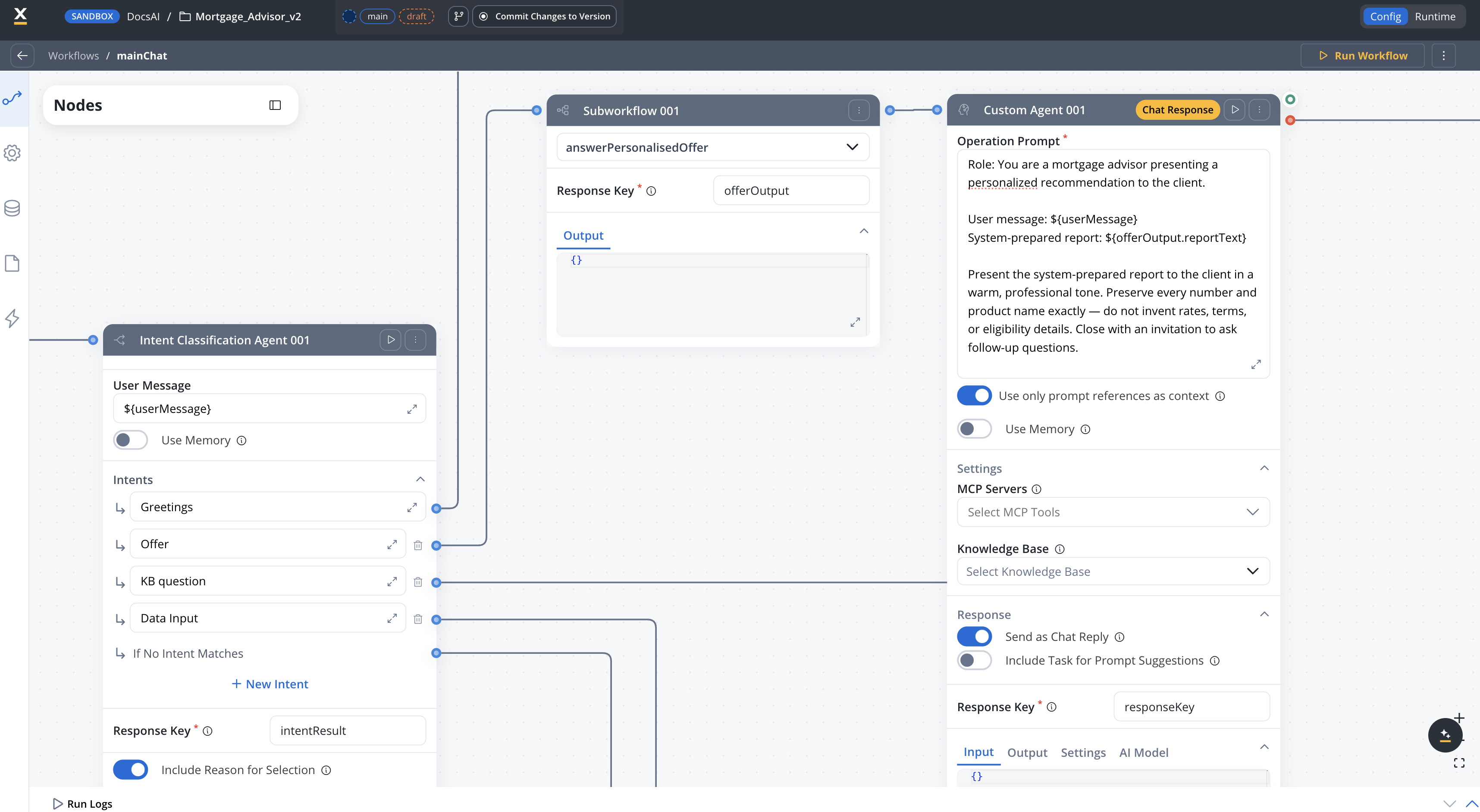 mainChat, connect a Subworkflow node on the Intent 2 branch that calls answerPersonalisedOffer, with Response Key offerOutput. Pass ${userMessage} as the userMessage input. Then add a Custom Agent after the Subworkflow node to deliver the chat reply — see Step 5e below.