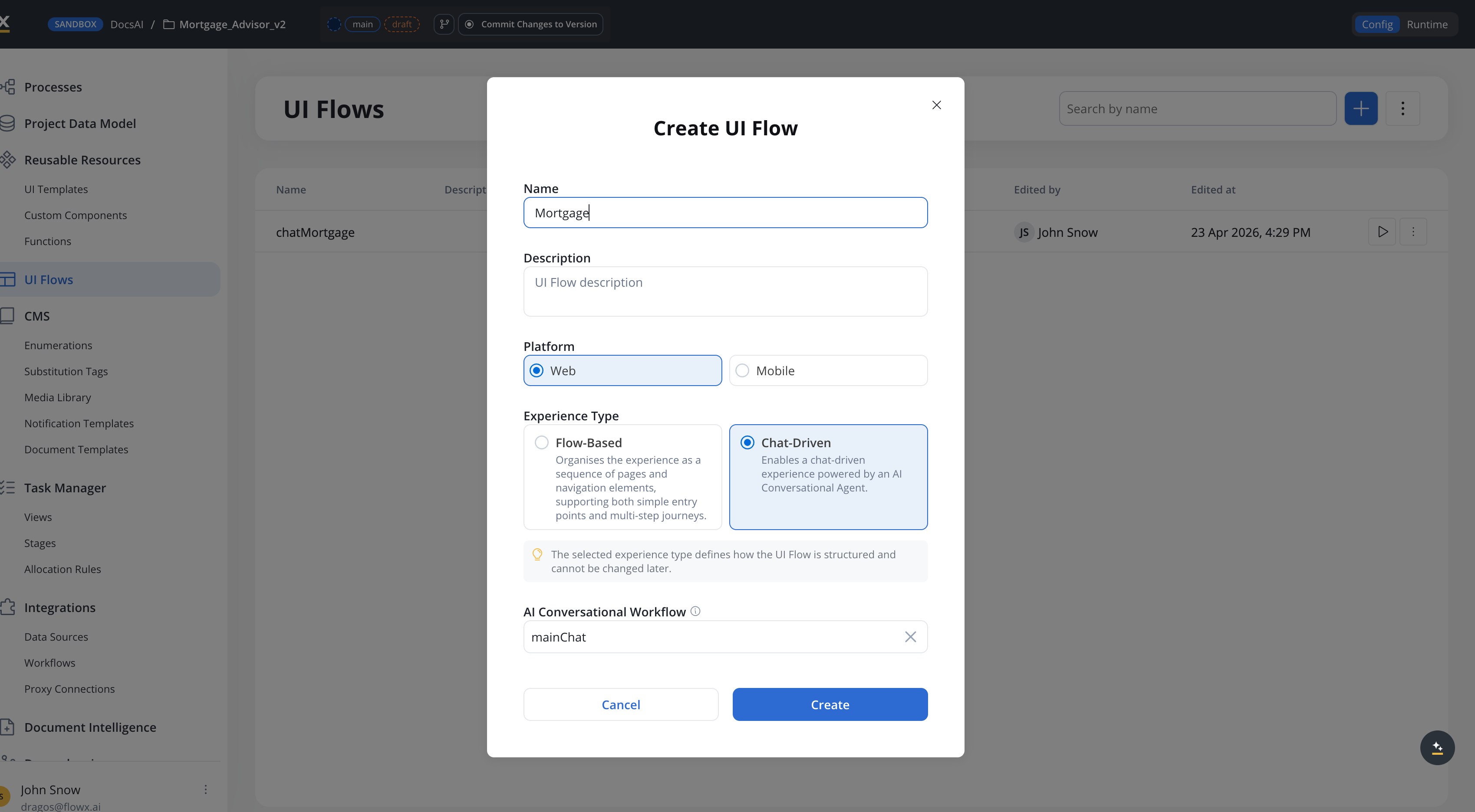 Go to UI Flows and create a new UI Flow, selecting Chat-Based as the experience type. Set