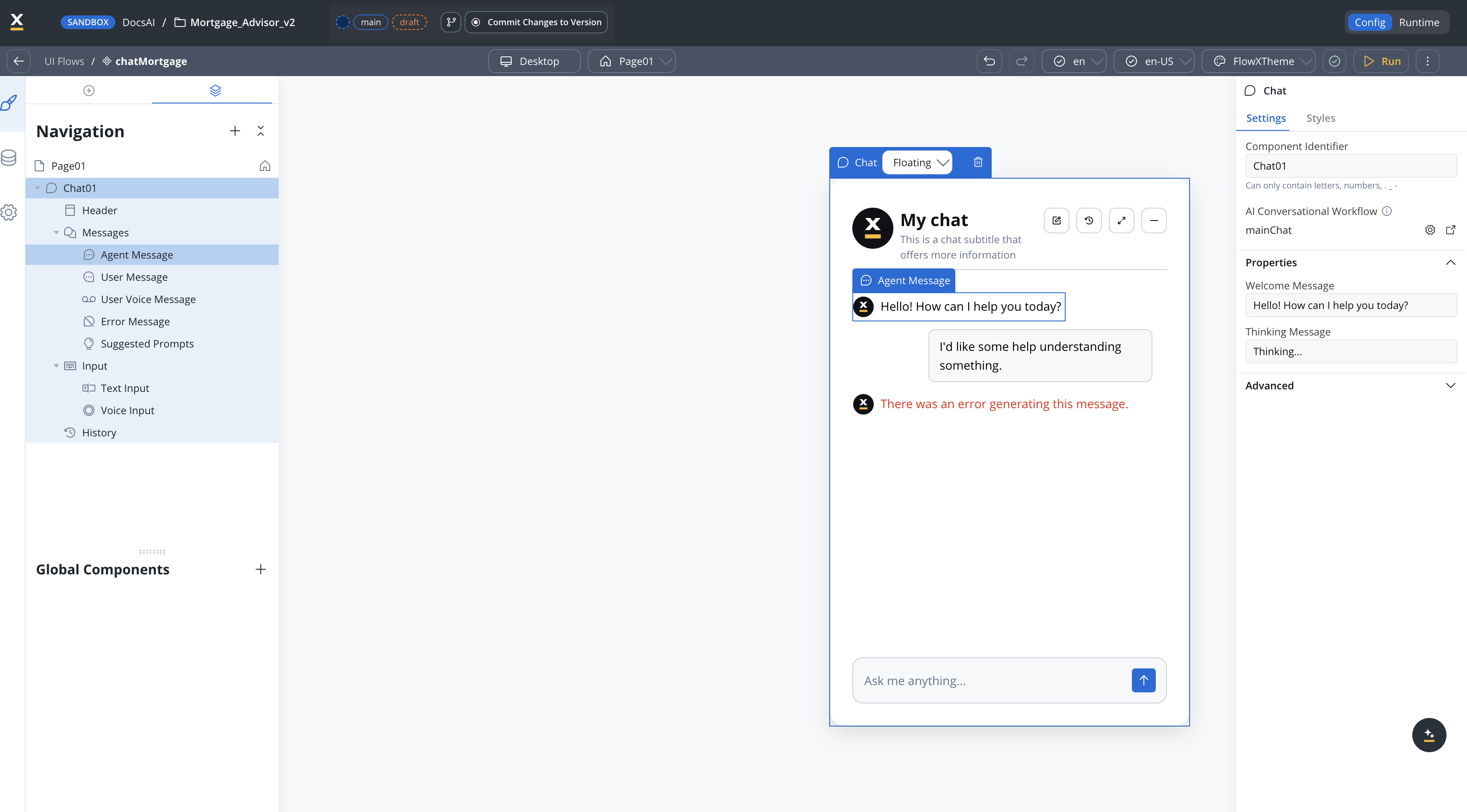 mainChatwith parameterized starting messages, e.g., “Help me refinance order $” from an account page - Navigate in UI Flow node — add an action branch that opens a mortgage application form with pre-filled data when the user accepts a recommendation