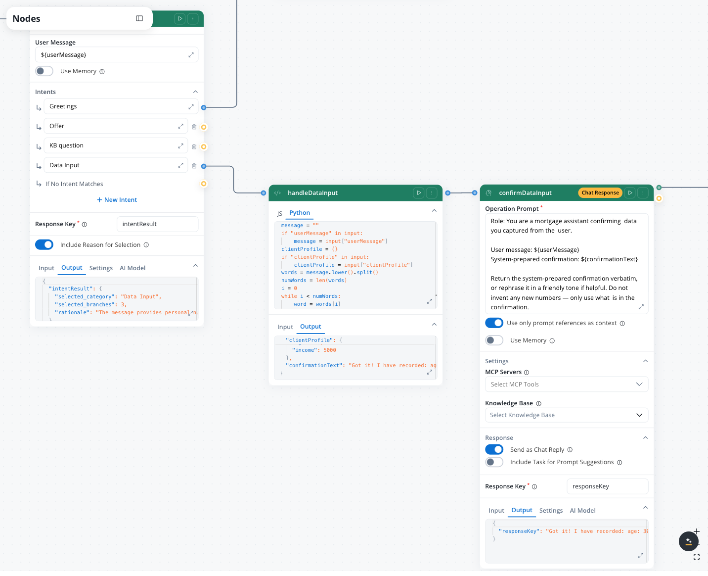 The Intent 4 branch combines a Script node (for deterministic data extraction) followed by a Custom Agent node (to confirm what was captured and send the chat reply). Script nodes cannot send chat replies on their own — only Custom Agent nodes can.3a: handleDataInput Script