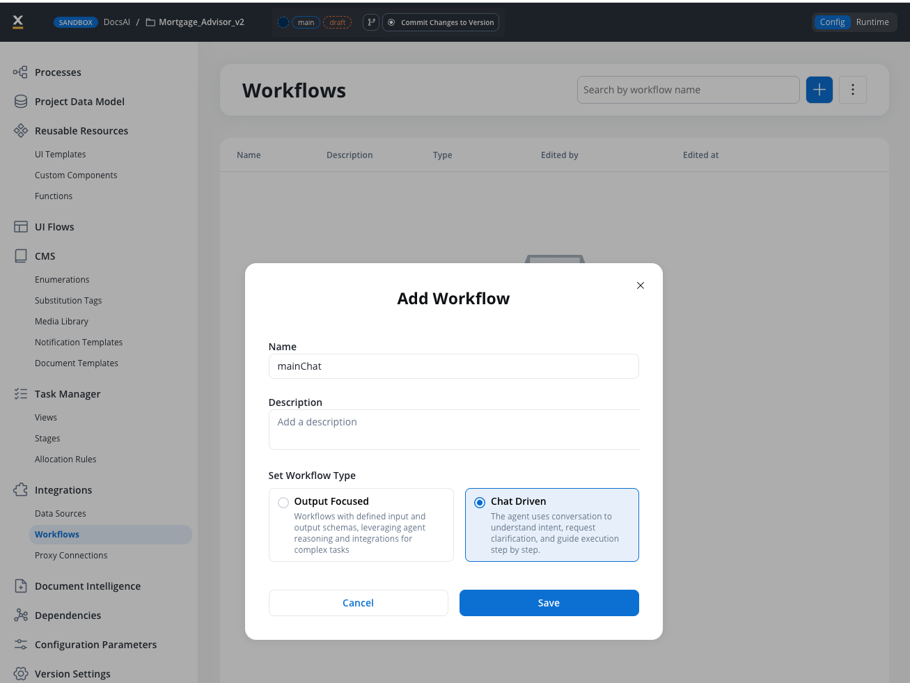 Create a workflow namedmainChat and select Chat Driven as the workflow type.