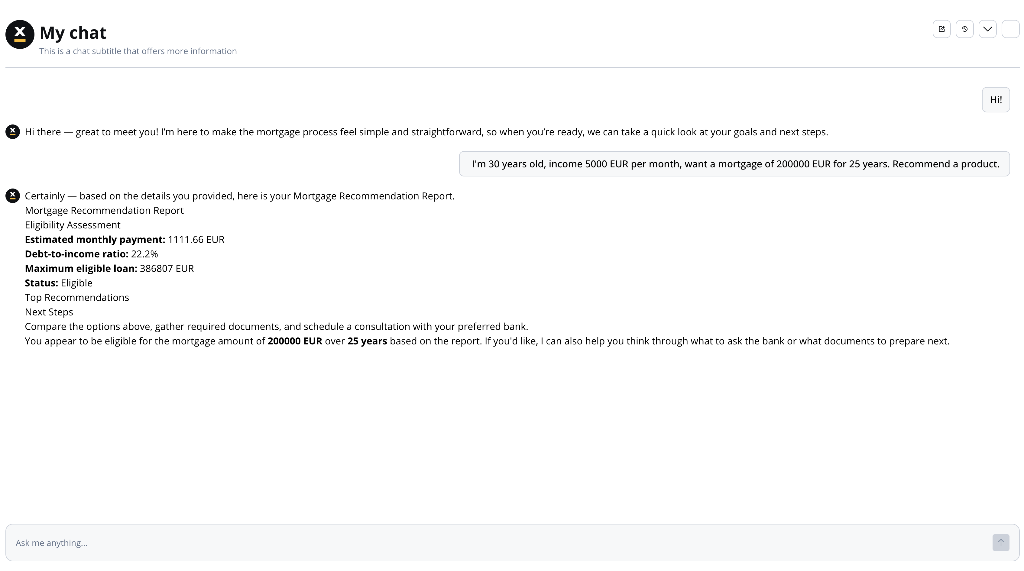 | 3 | ”Loan of 200000 EUR for 25 years” | Acknowledges additional data (loan_amount, loan_duration recorded) |