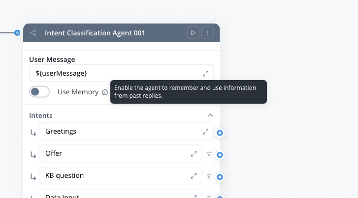 From the node palette, drag an Intent Classification Agent node (under AI Agents) onto the canvas and connect it to the Start node. Configure the node: User Message:${userMessage}