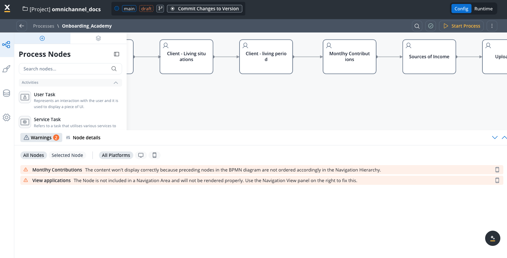 If you do not assign a user task to a navigation area, the platform will display a warning indicating that there are user tasks not included in the navigation structure (applies to all platforms).