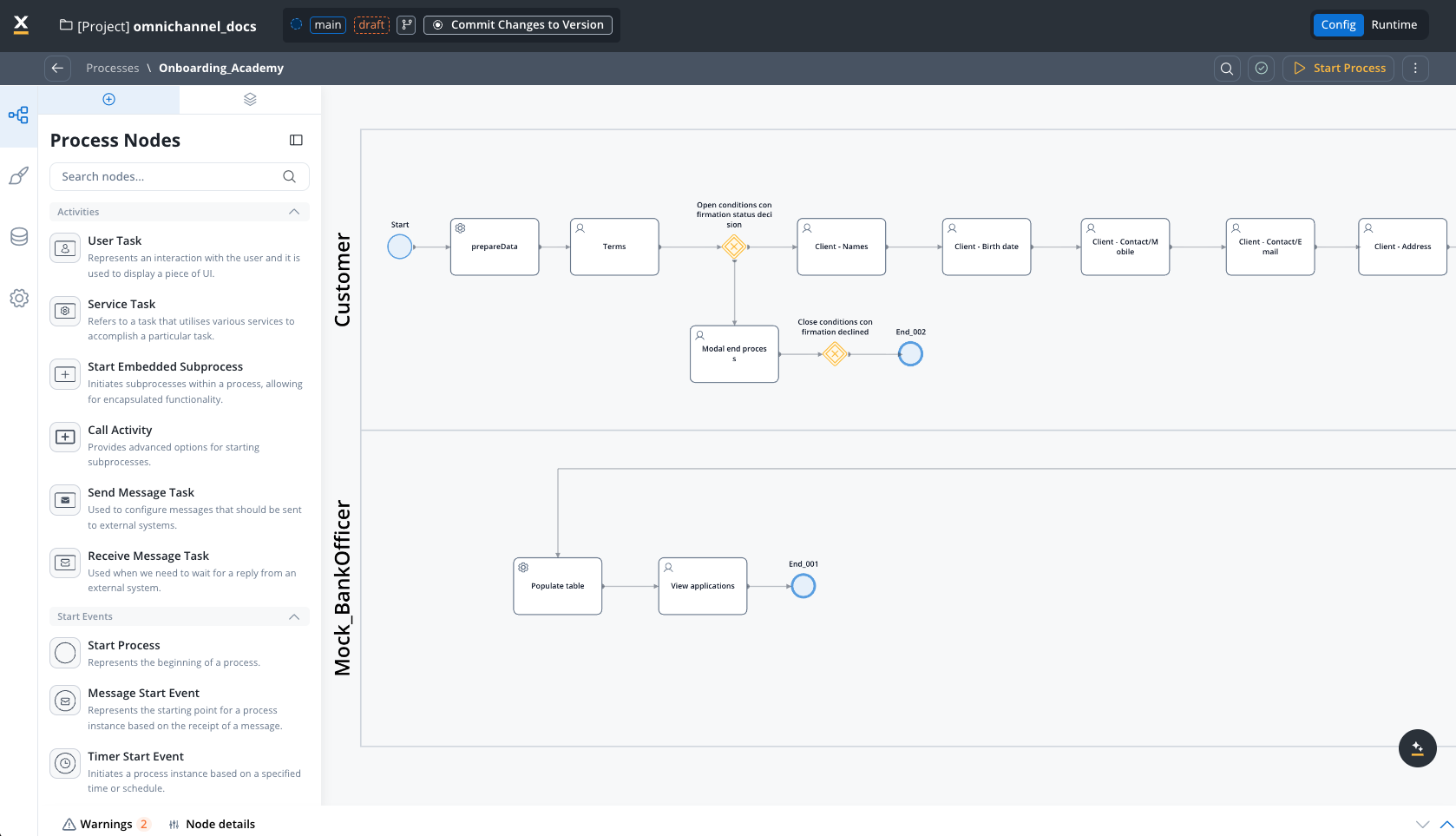 The Process Designer automatically validates your process and displays warnings for:- Missing required nodes: Processes must have at least one START and one END node