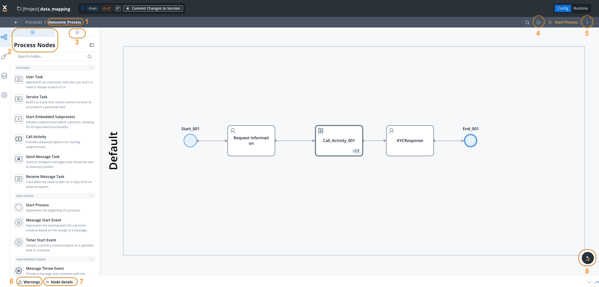 The main canvas area is where you design your process flow by adding nodes, connecting them with sequences, and organizing them into swimlanes. The canvas supports zoom, pan, and offers visual feedback for validation warnings.