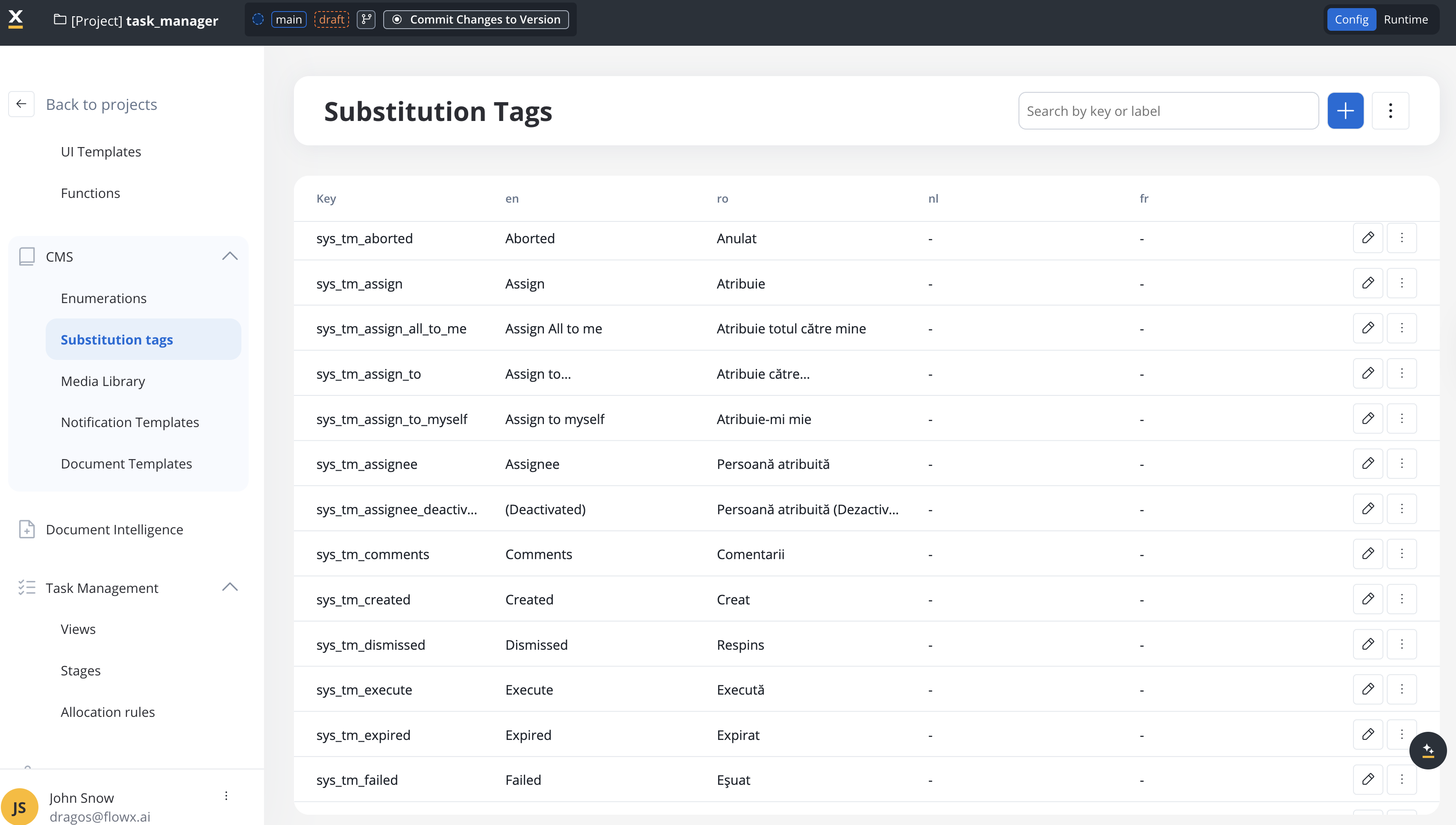 Manual Configuration Required: All 51 FlowX substitution tags must be configured manually in CMS for each language you want to support. They control custom Task Management UI elements outside of the data table.