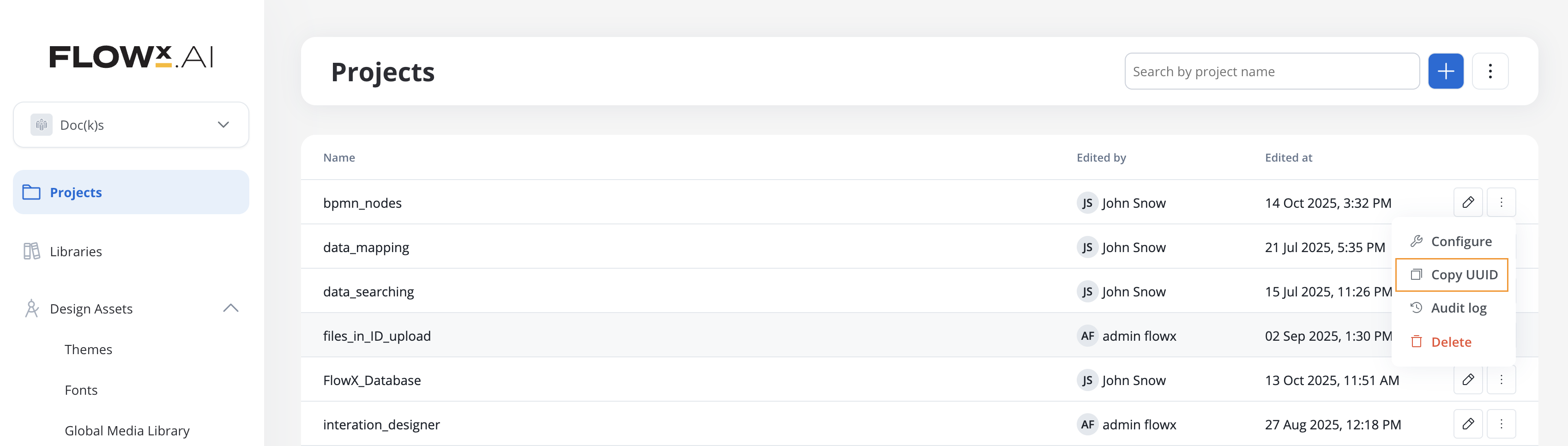 The project ID (also called application ID or app ID) identifies your project within FlowX. Itβs one of the most commonly required identifiers.Navigate to Projects