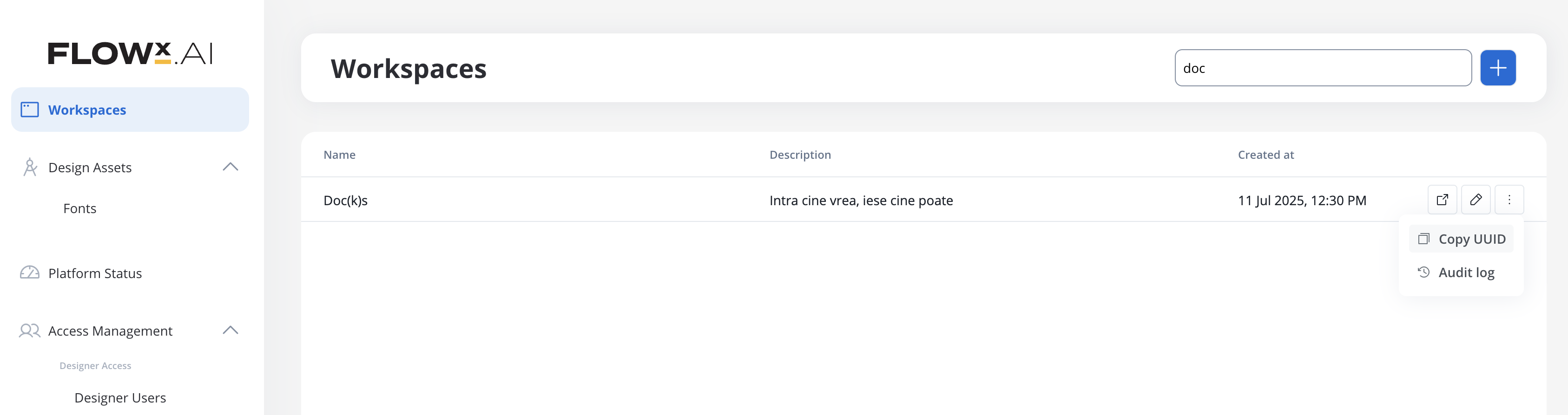 Workspace ID | Fx-WorkspaceId | UUID | Organization Settings β Workspaces OR URL | Kafka headers, API calls |