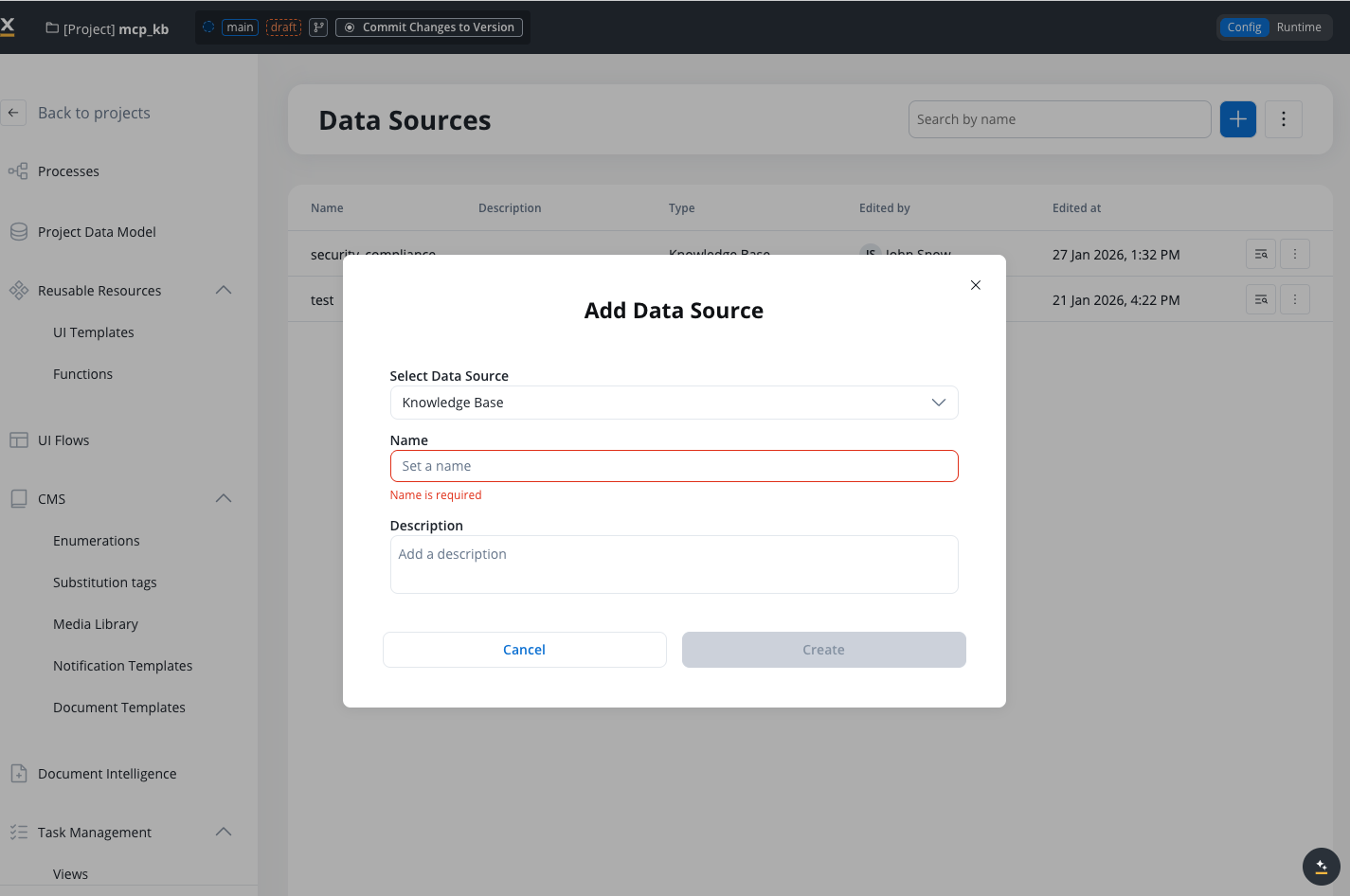 - Create Knowledge Base: Add a new Knowledge Base data source in Integration Designer