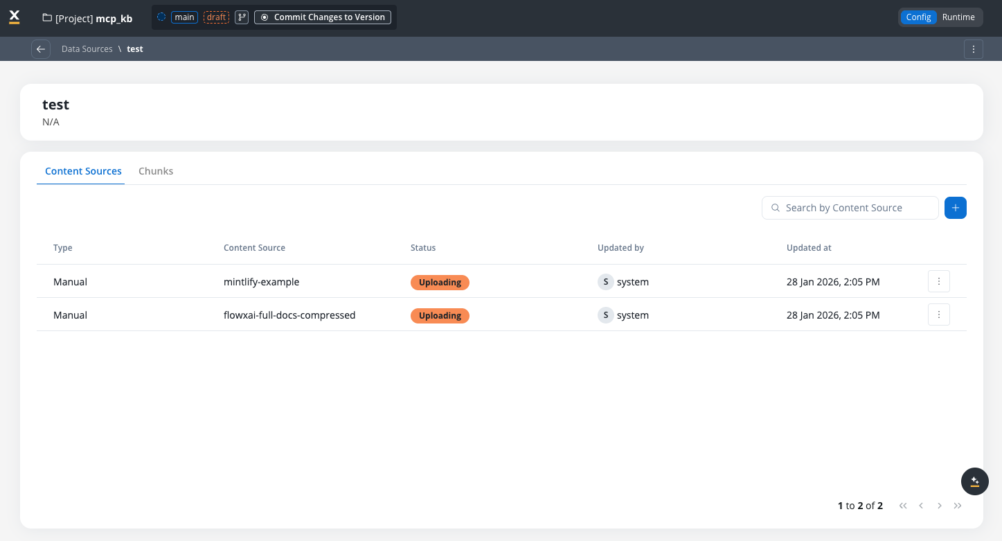 Content sources represent individual collections of information within a Knowledge Base. Each content source can be:- Manual: Files uploaded through the Knowledge Base admin interface