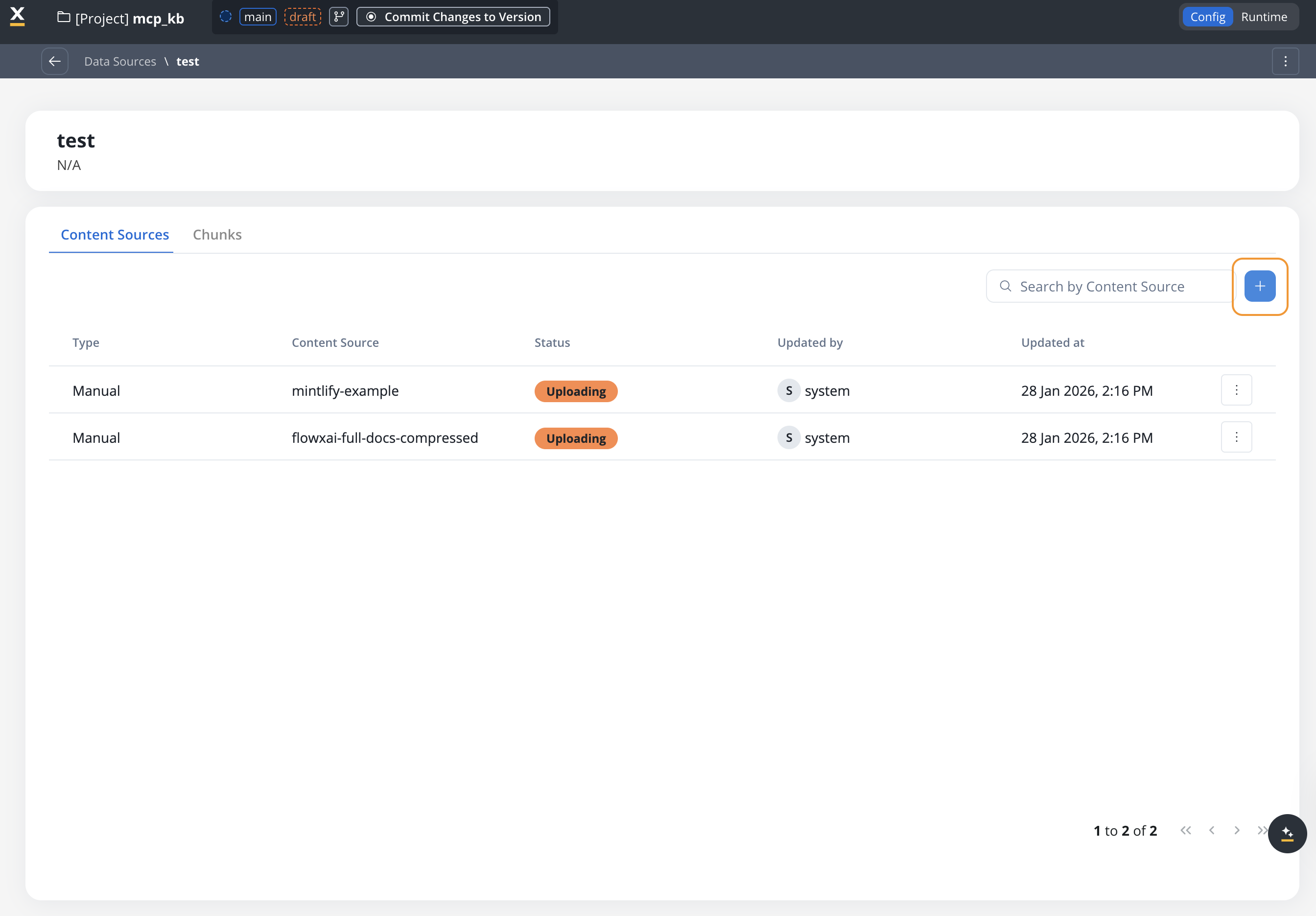 Navigate to your Knowledge Base to see all content sources. The content sources list displays: