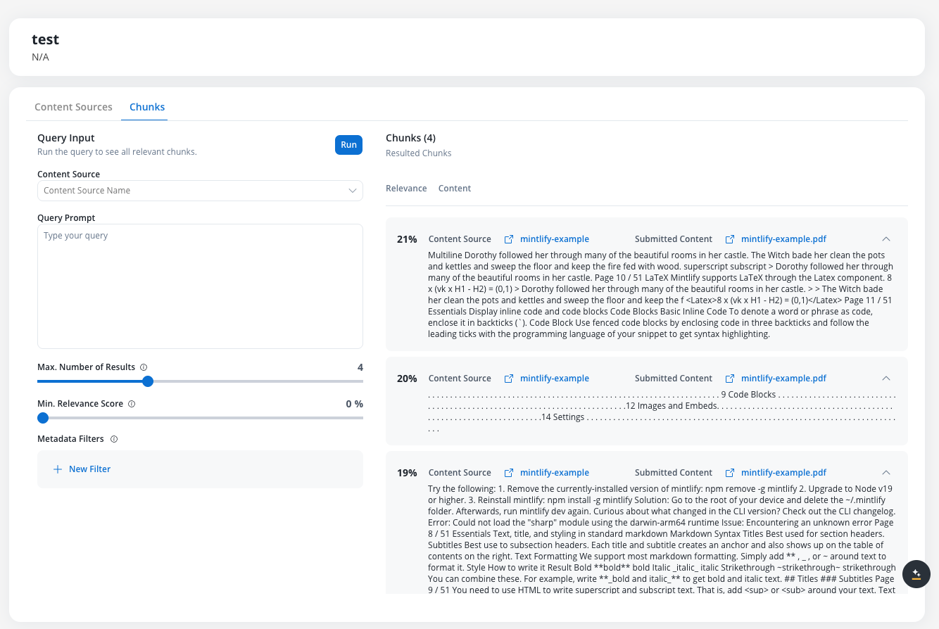 Chunks are the individual pieces of content that AI agents query. To view and test chunks: