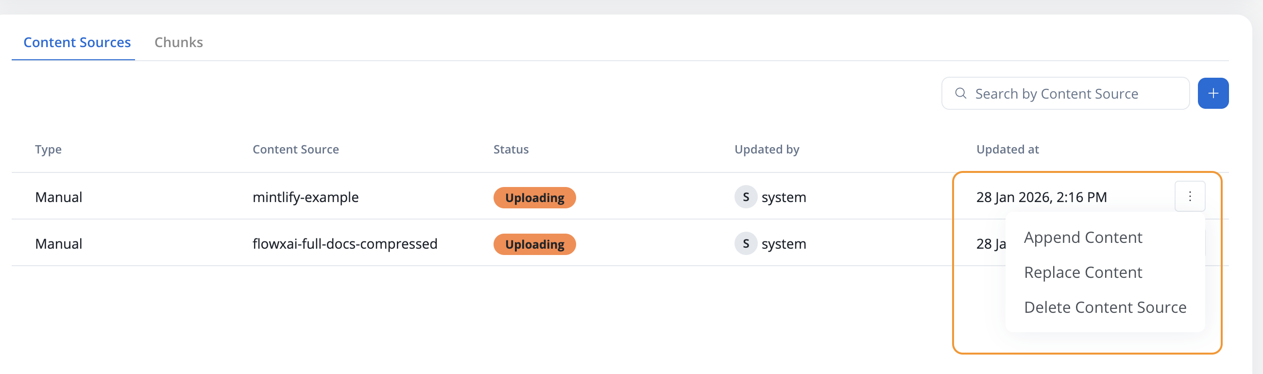 If you select a file with the same name as an existing content source, you’ll see a warning:- Append Content: Add the new document’s content to the existing content source