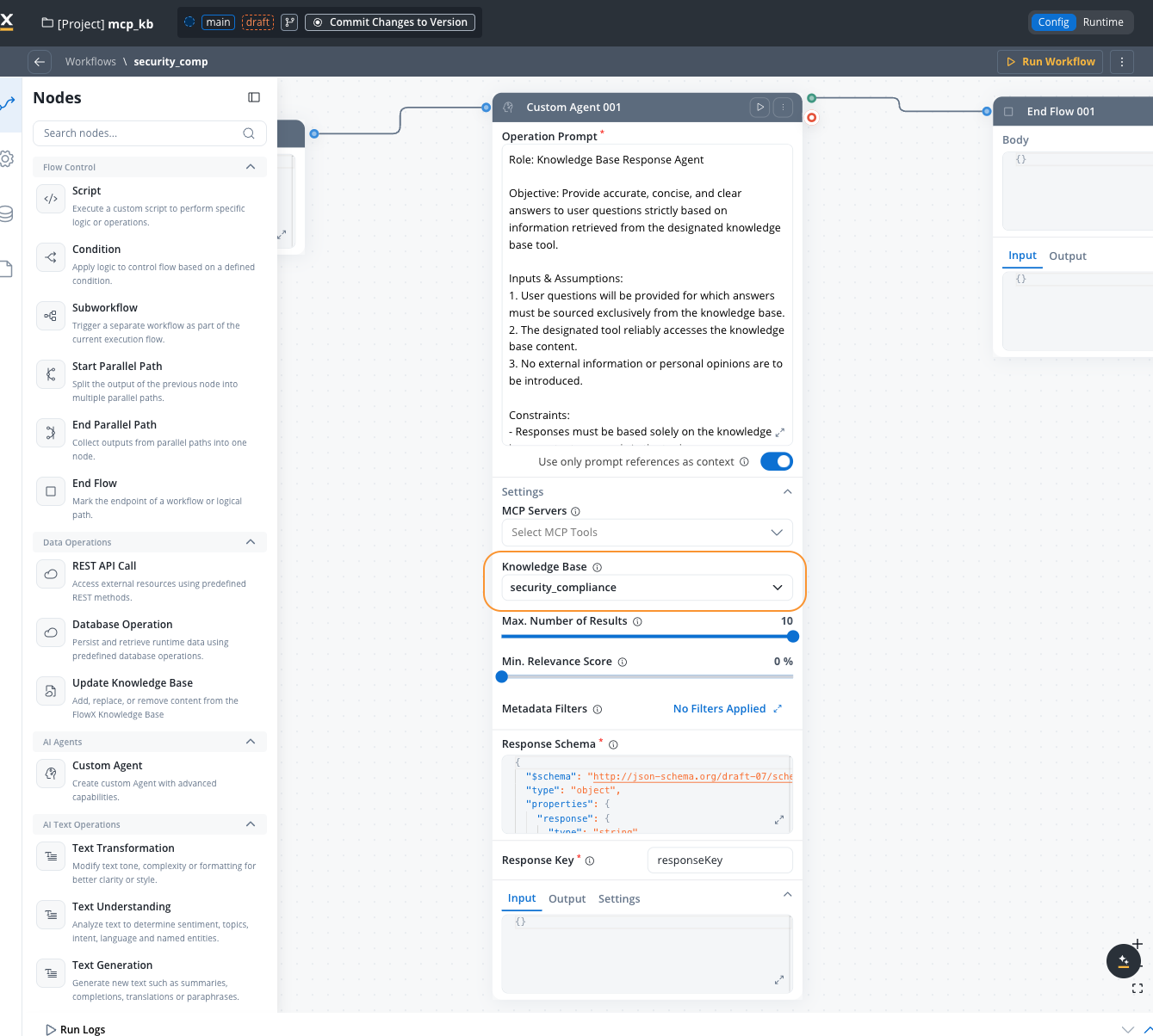 Custom Agent nodes can query Knowledge Bases to retrieve contextual information when generating responses.Configuring custom agent with knowledge base