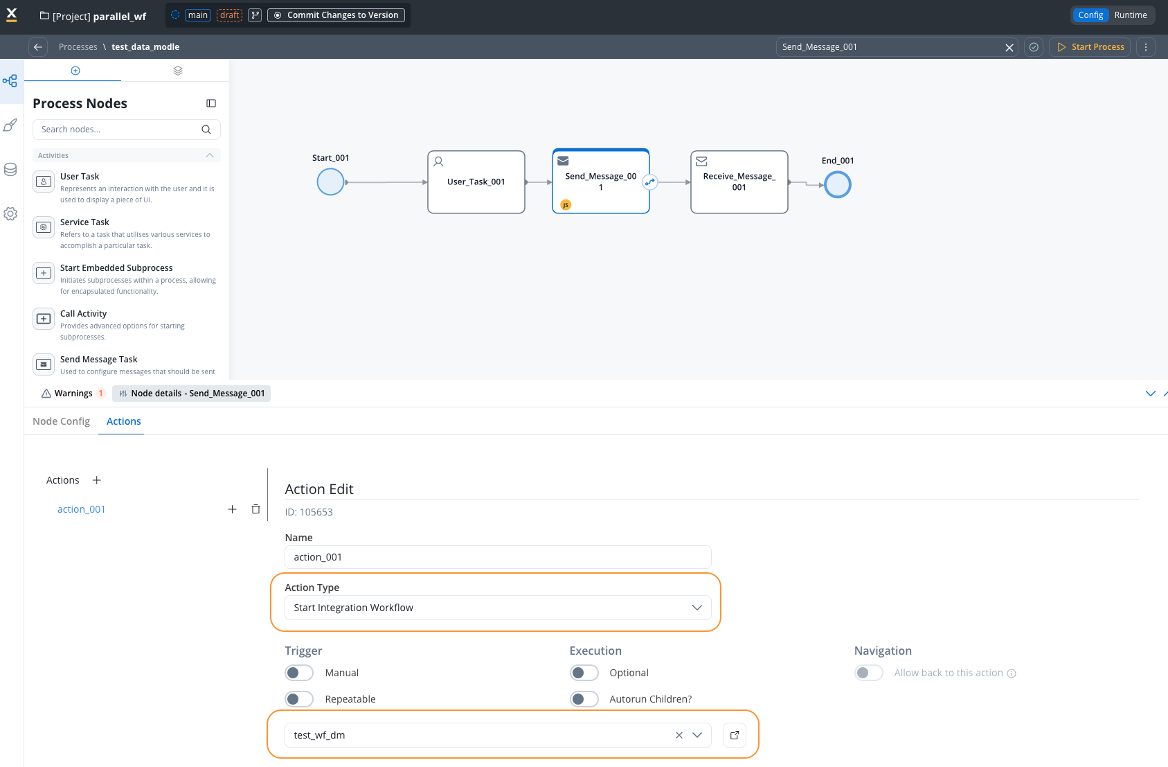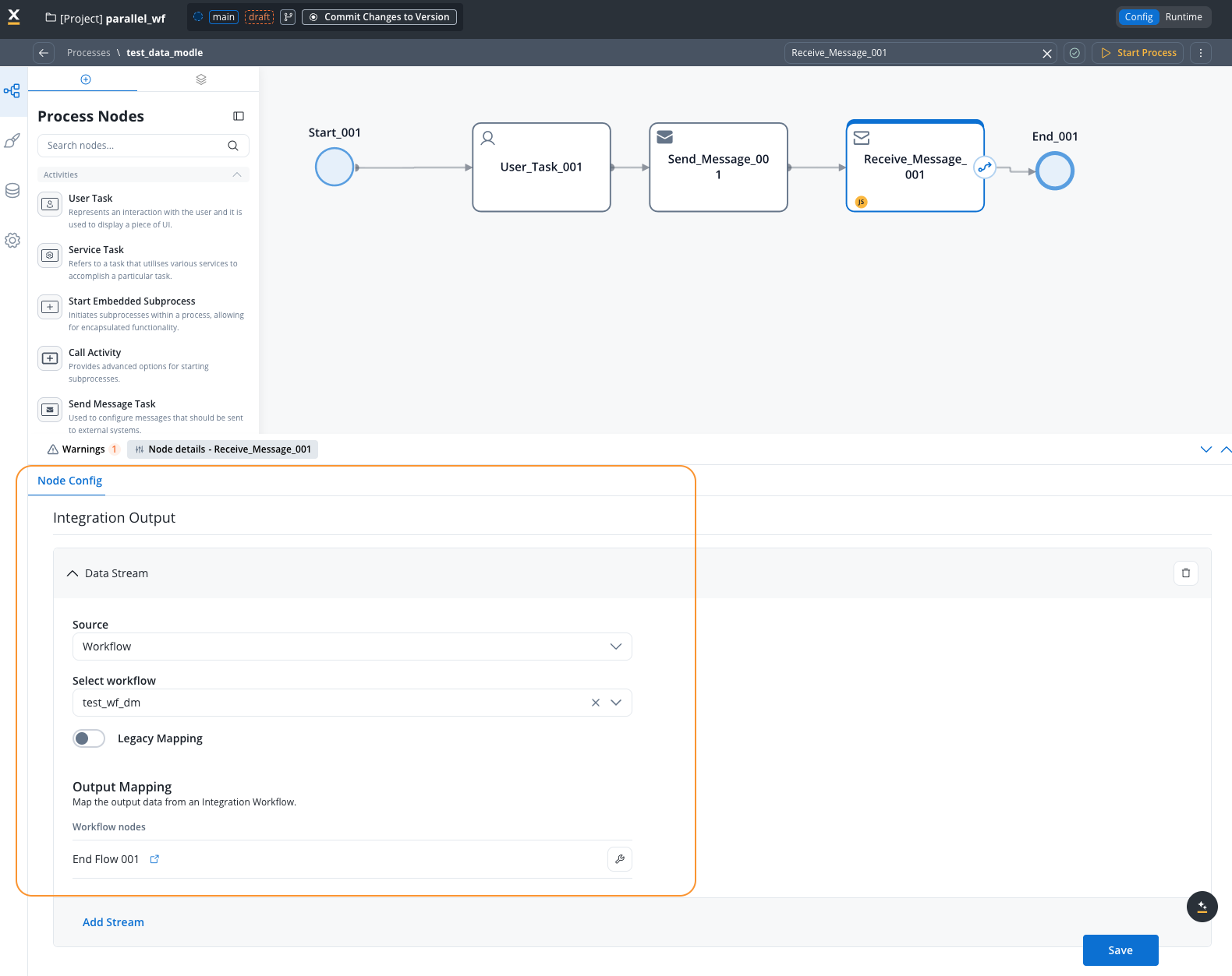 The Start Integration Workflow action requires two mapping configurations: Input Mapping (Process → Workflow): Maps the username from the main process to the workflow’s expected input variable:- Add a data stream for the workflow on the Receive Message Task