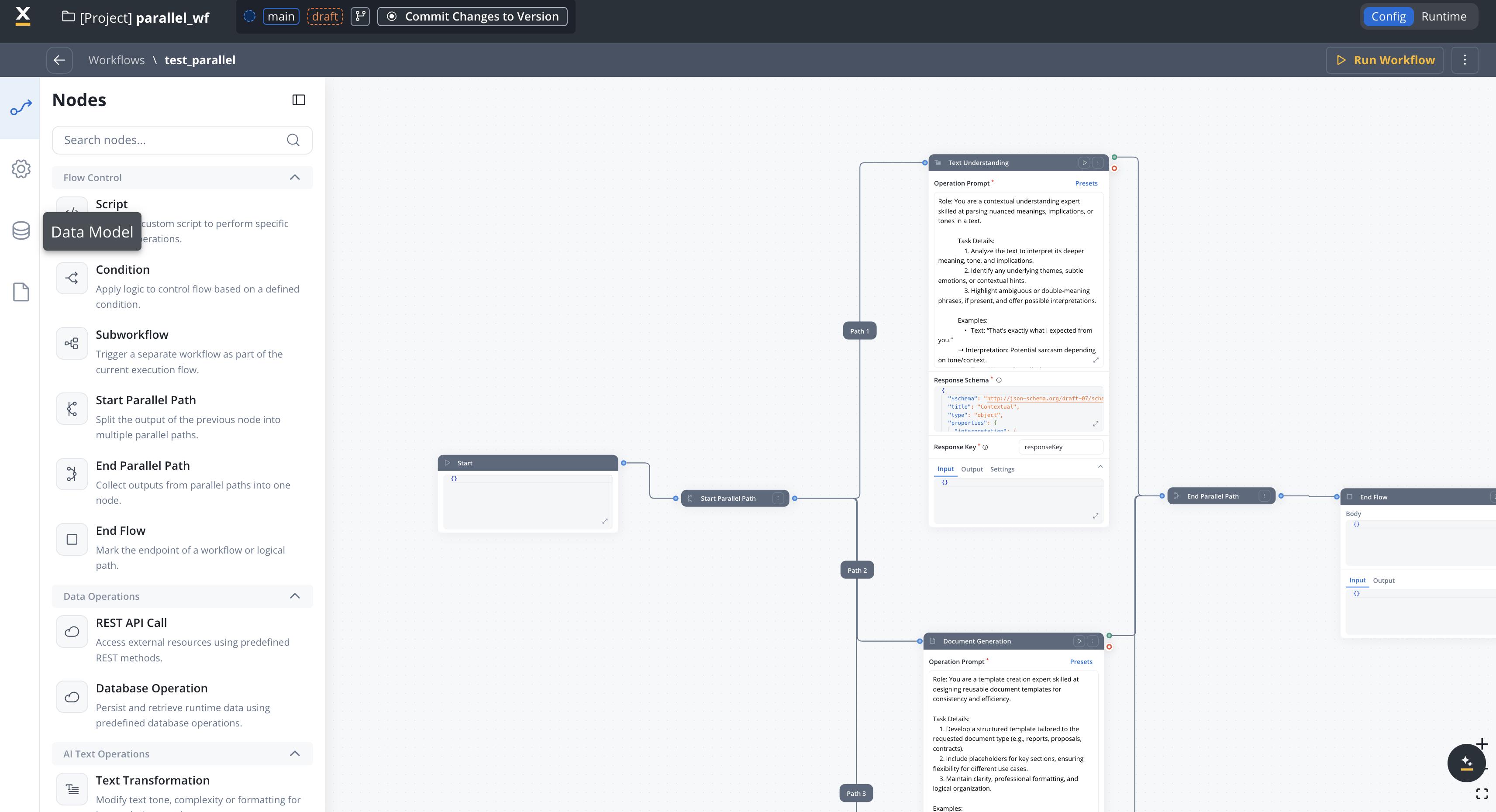 A Workflow Data Model defines the structure of data used throughout a workflow’s execution. It consists of:- Entities: Logical groupings of related data (for example, Customer, Order, Payment)