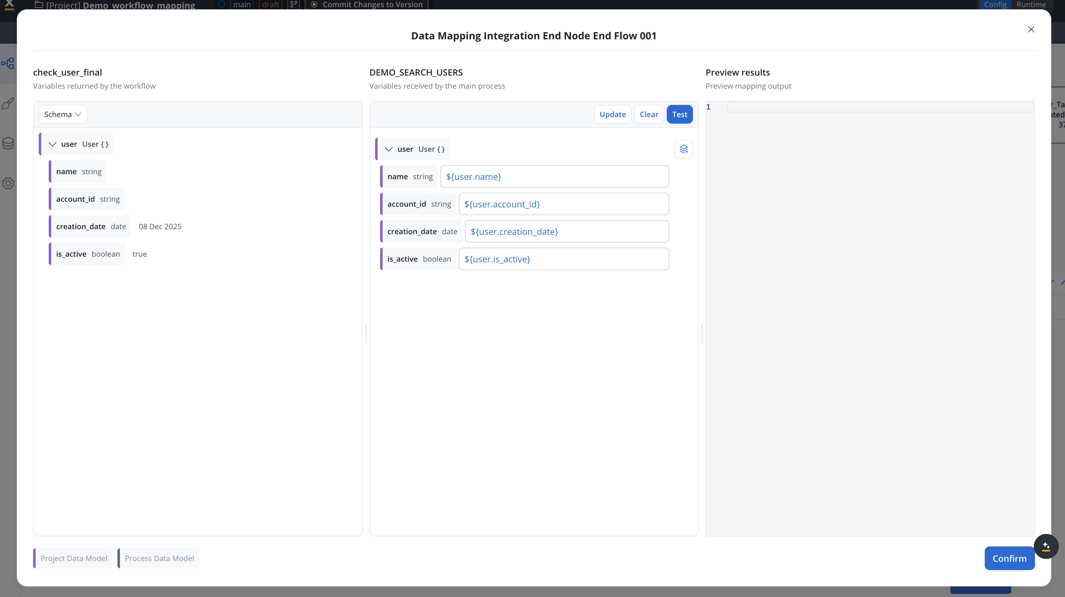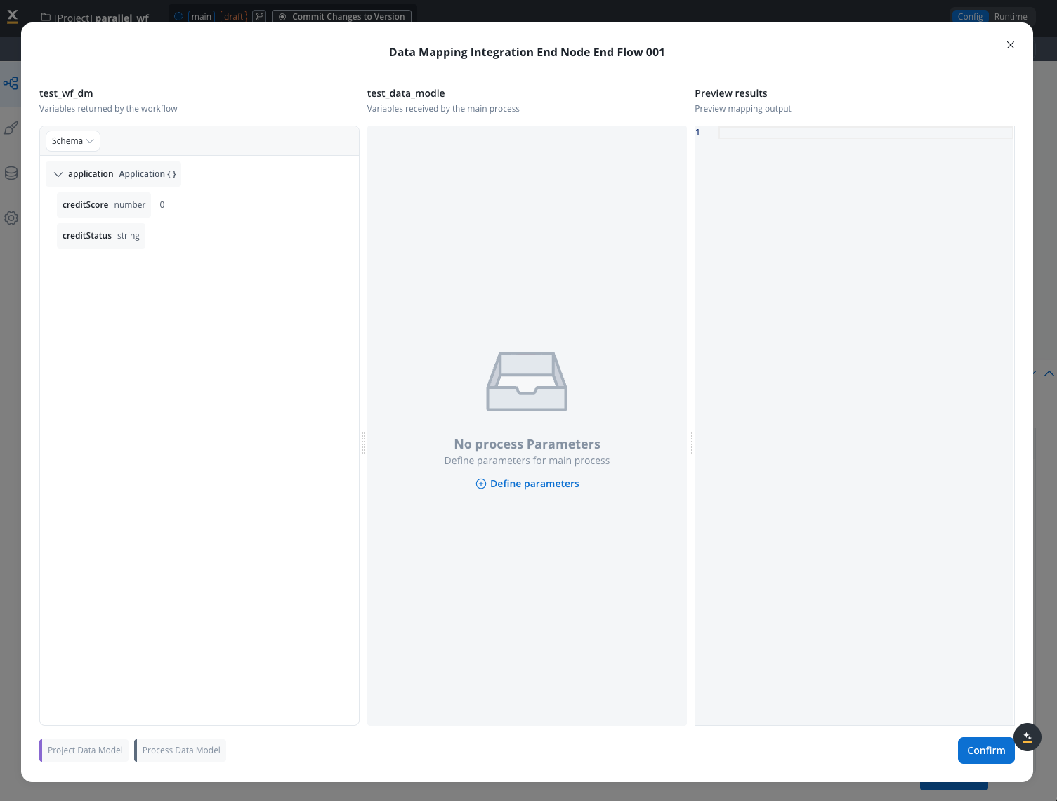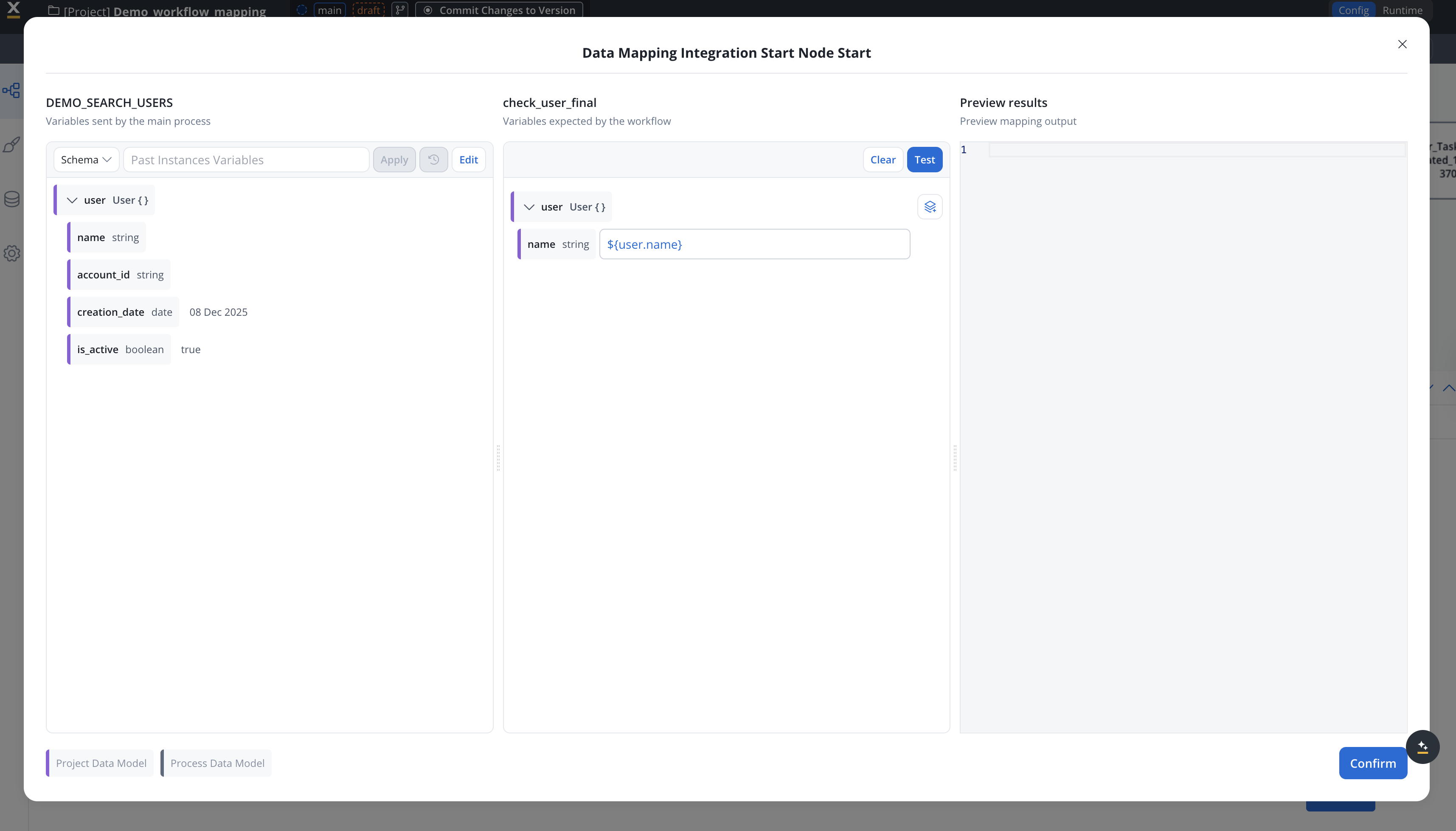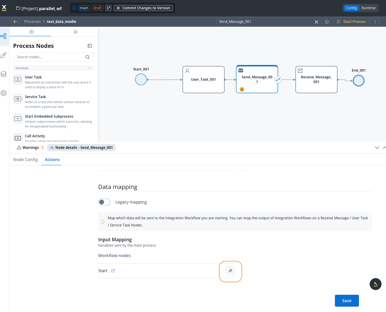 Use data mappers to pass data from processes to workflows. The data mapper configuration in the Start Integration Workflow action maps process data to workflow input parameters, independent of the workflow’s input parameters definition.- Pre-filling the Start Node when designing/testing workflows