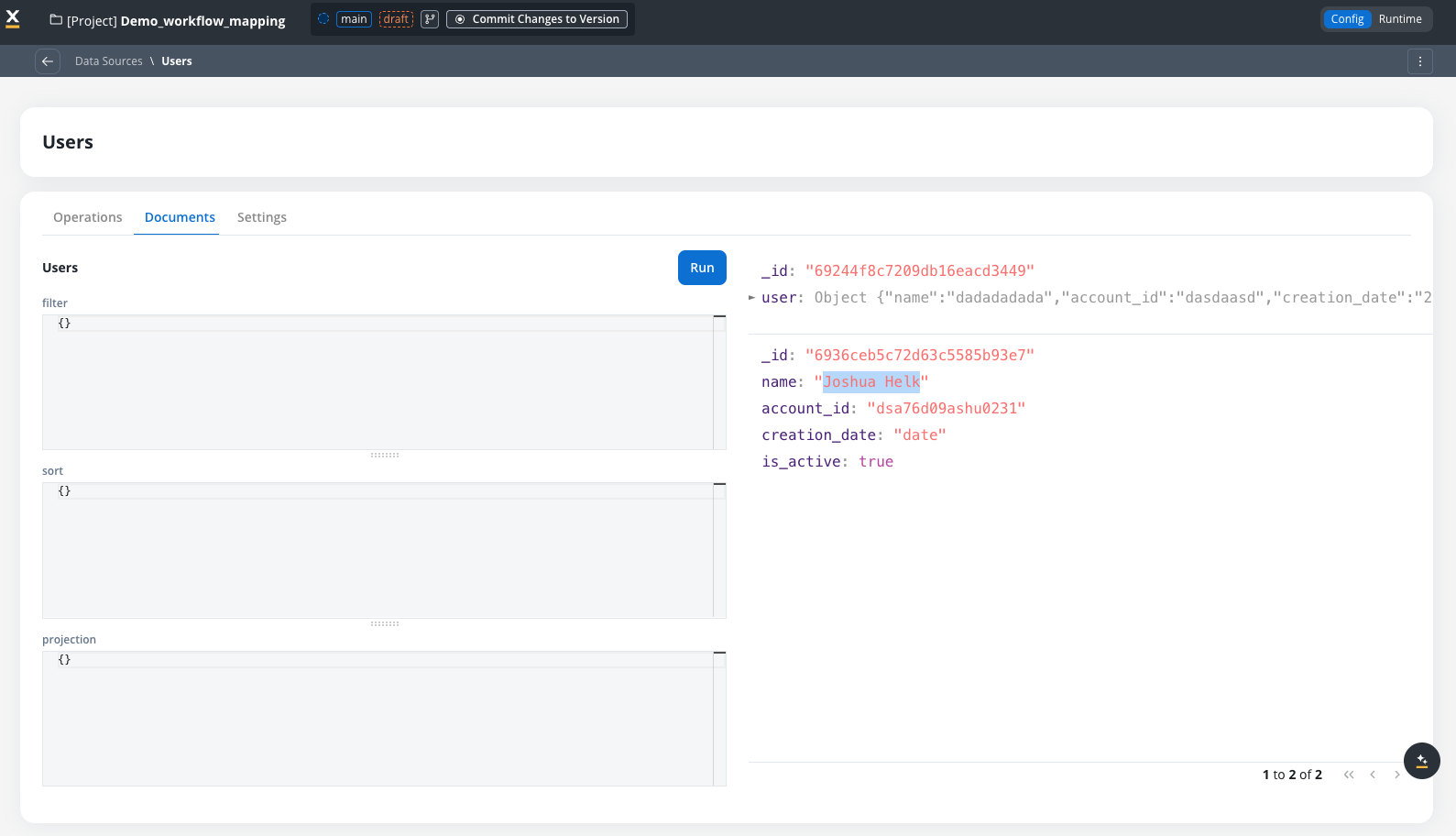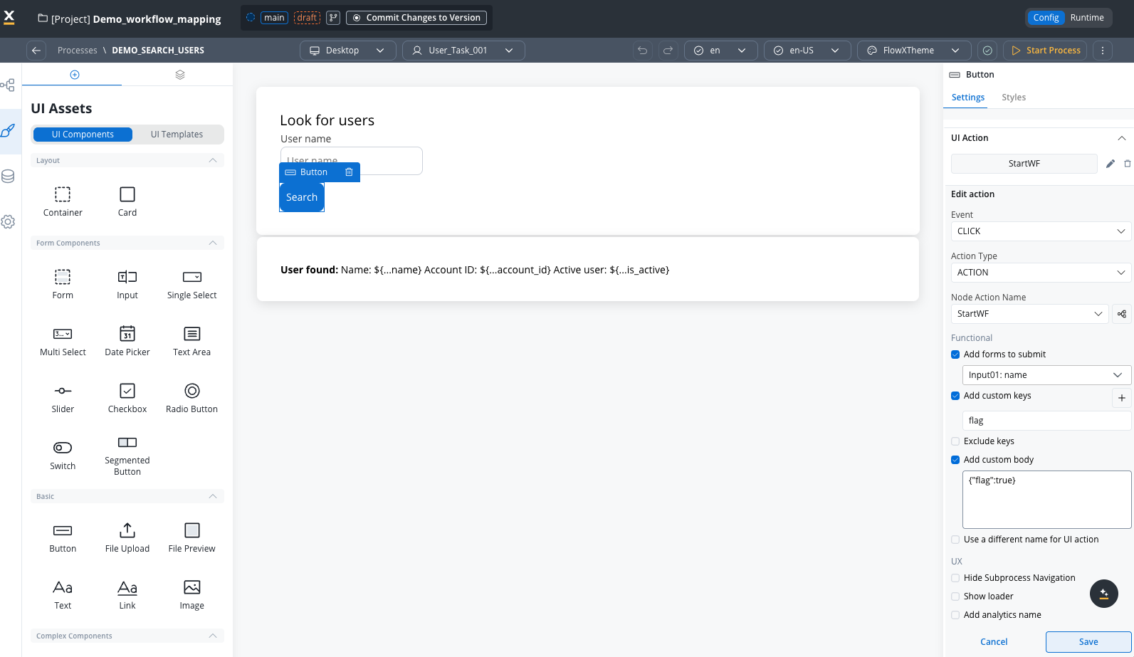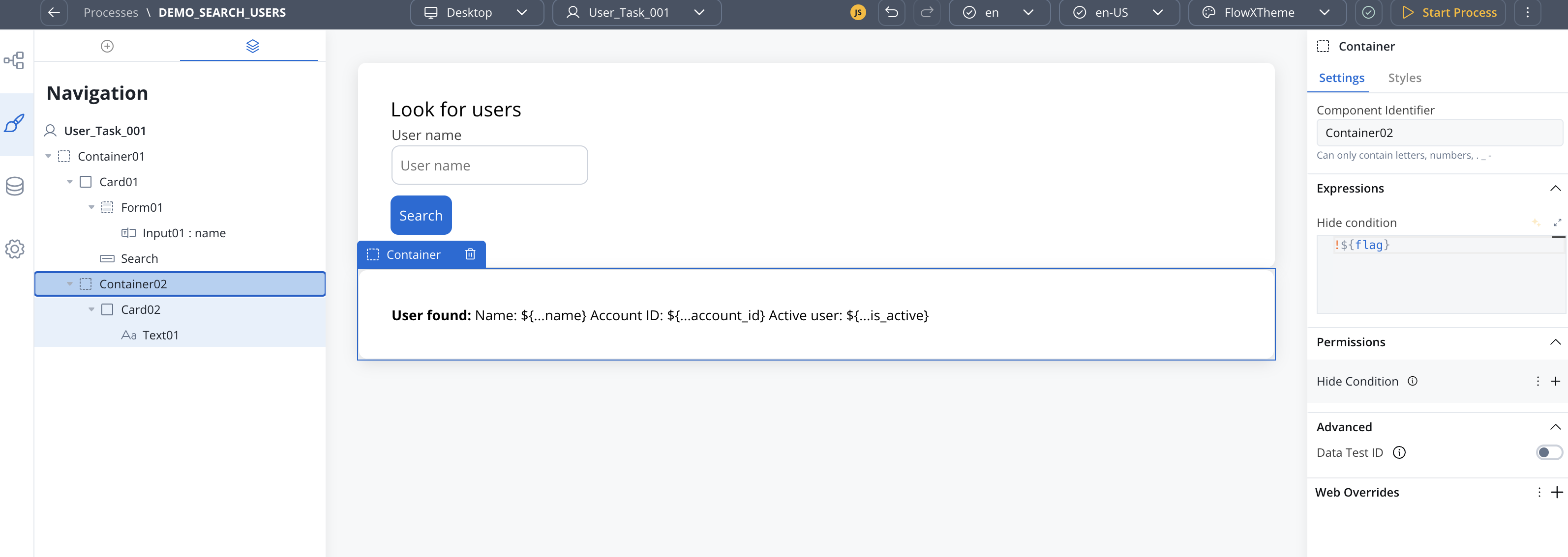 This example demonstrates a workflow that searches for a user in the FlowX database using a username and returns the user’s available information.Workflow data model configuration
